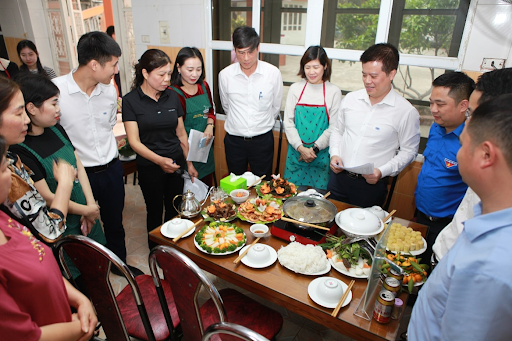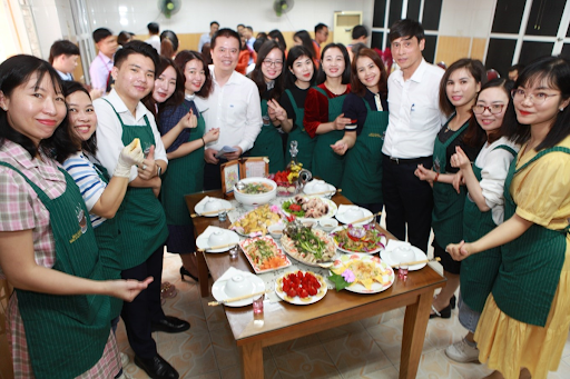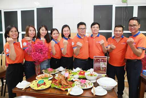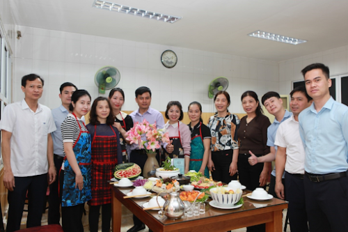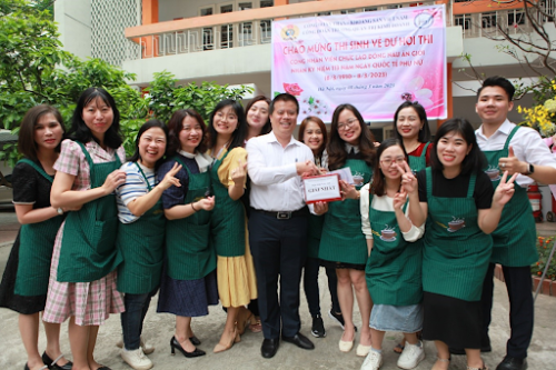 Đ/c Phạm Đăng Phú, Bí thư Chi bộ, Hiệu trưởng Nhà trường cùng các Đ/c trong Ban Chi ủy và Ban Chấp hành Công đoàn Trường tặng hoa chị, em.